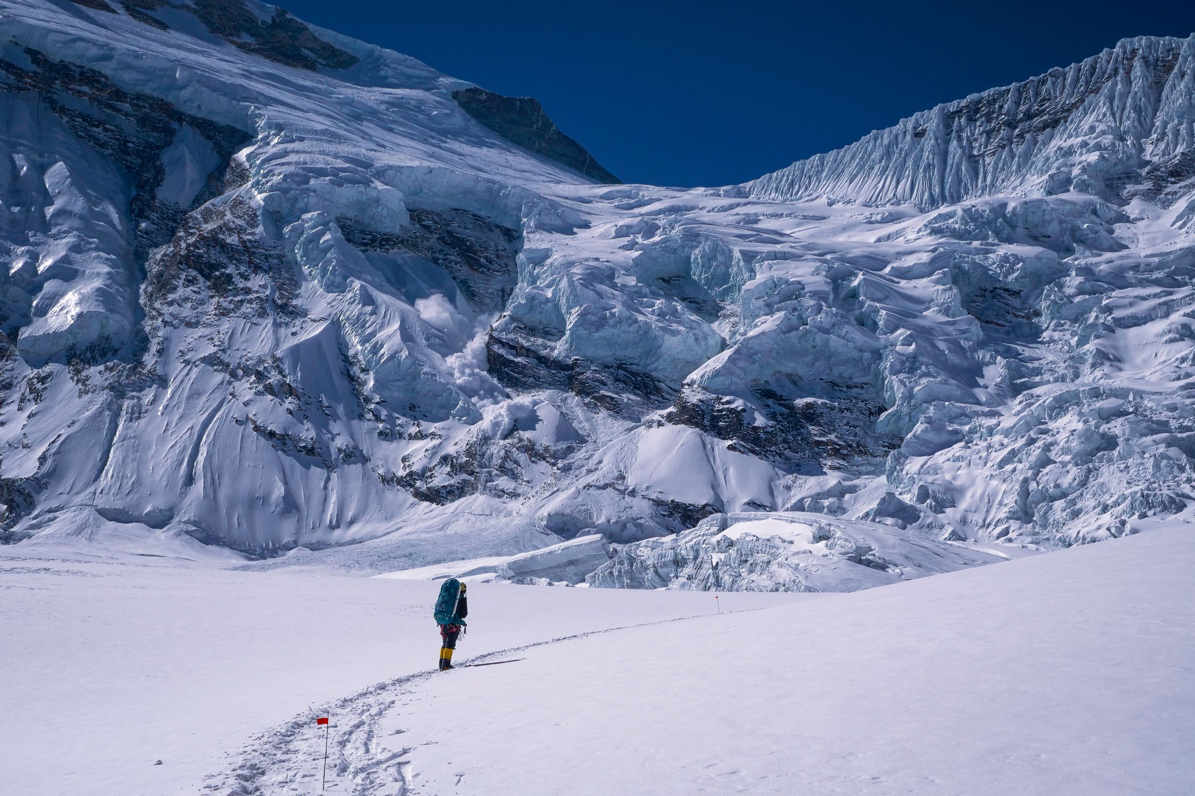 یک کوه نورد در حال نزدیک شدن به شکافهای یخچالی انبوه در کمپ یک ماناسلو